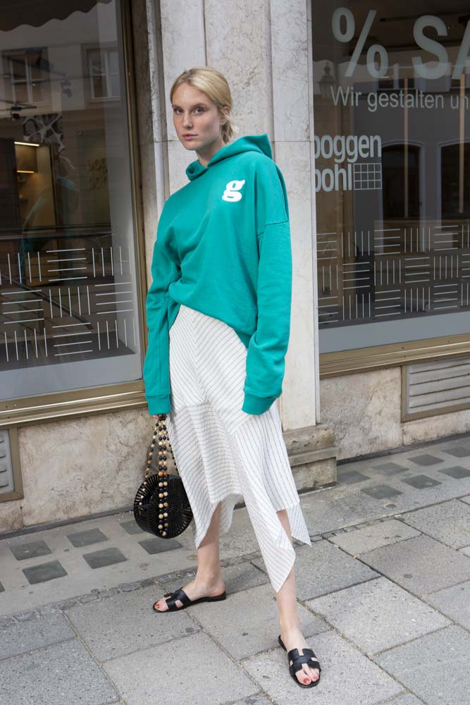 Unten: GNTM Siegerin Kim Hnidzo kombiniert den Glamometer Hoodie zum weißen Zipfelrock von Stella McCartney und sommerlichen Sandalen von Hermès. Casual Friday Outfit