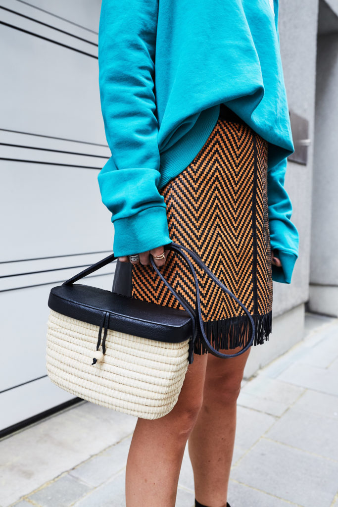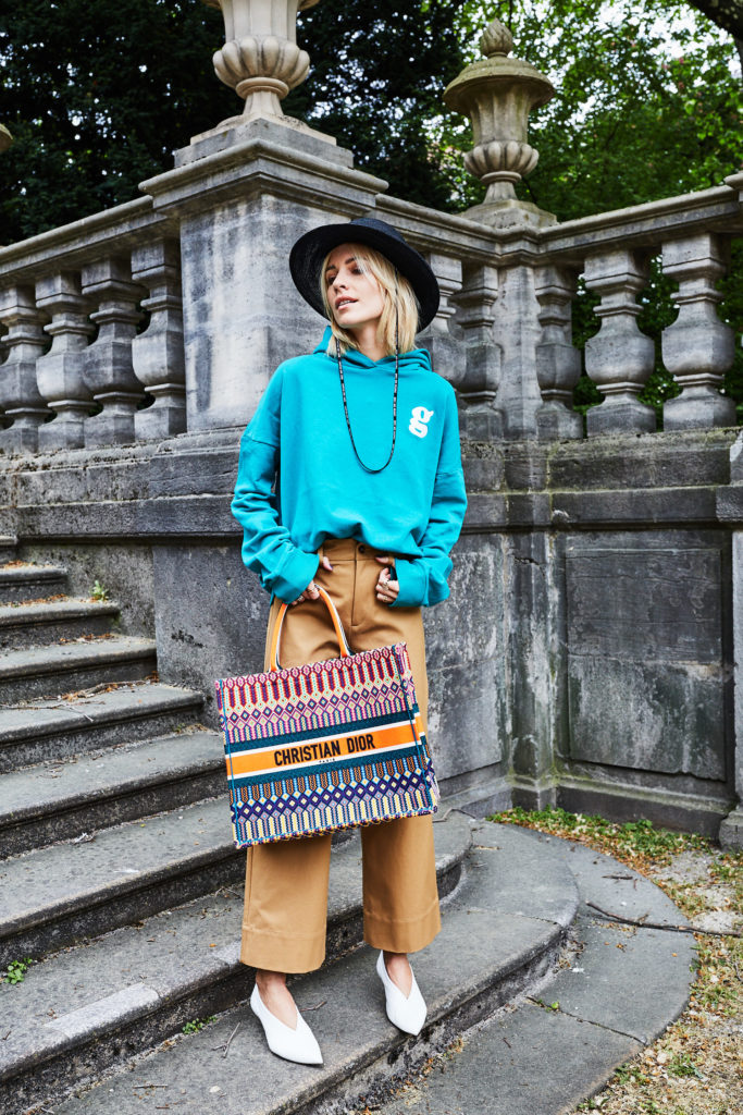 Unten: Mega Farbkombination. Hier stylt Viky den türkisfarbenen Kapuzenpullover zur sandfarbenen Chino von Sois Blessed. Hut und Tasche: Dior