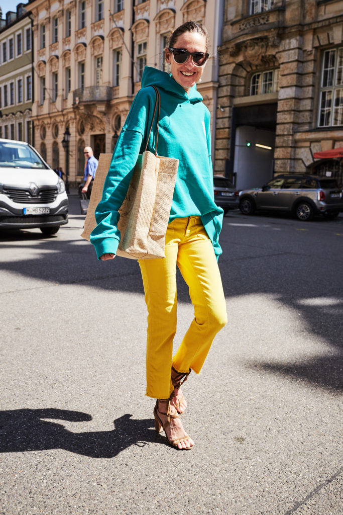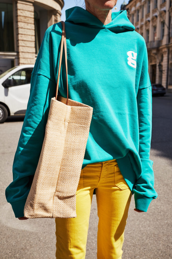 Das liegt erstens an den tollen Farben. Starke, lebensbejahende Buntstiftfarben sind ja generell ein großes Mode-Thema. Aber während man sich in kanariengelben Hosenanzügen oder in absurd kombiniertem Mustermix manchmal verkleidet fühlt, füllt der Glamometer Hoodie genau den Zweck: trendige Farbe, aber „machbar“, nachvollziehbar und leicht integrierbar in die vorhandene Garderobe.