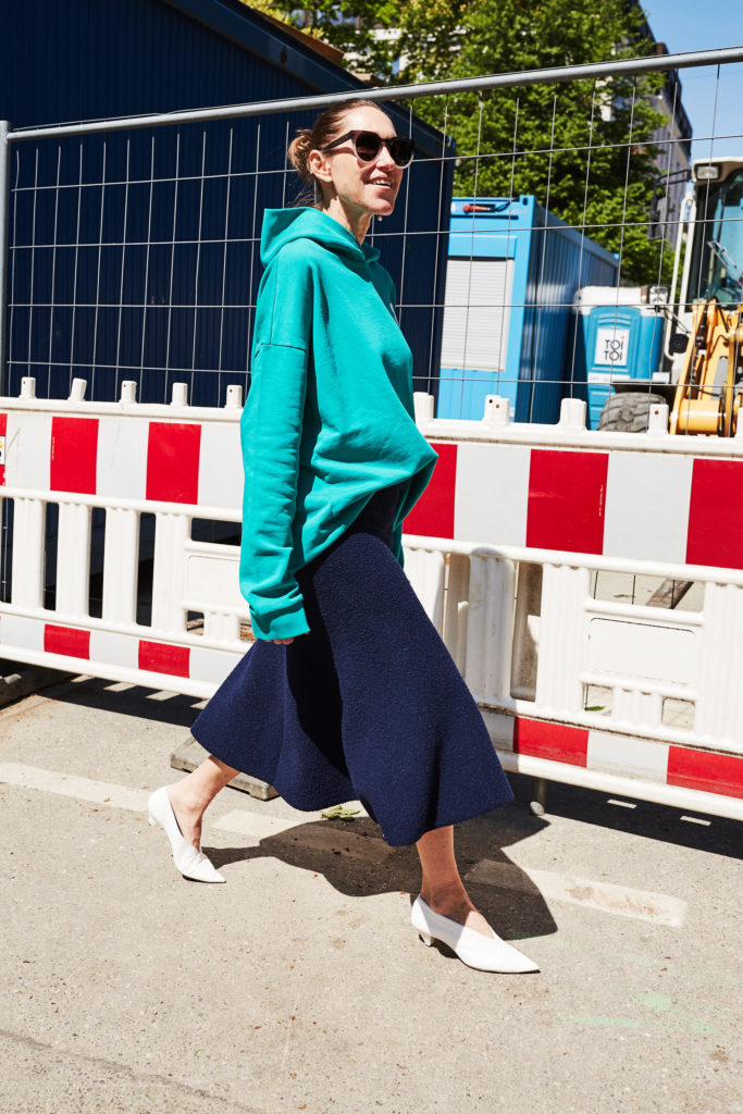 Unten: Frau Weber im Business Outfit. Glamometer Hoodie zum dunkelblauen Godet-Rock von Céline