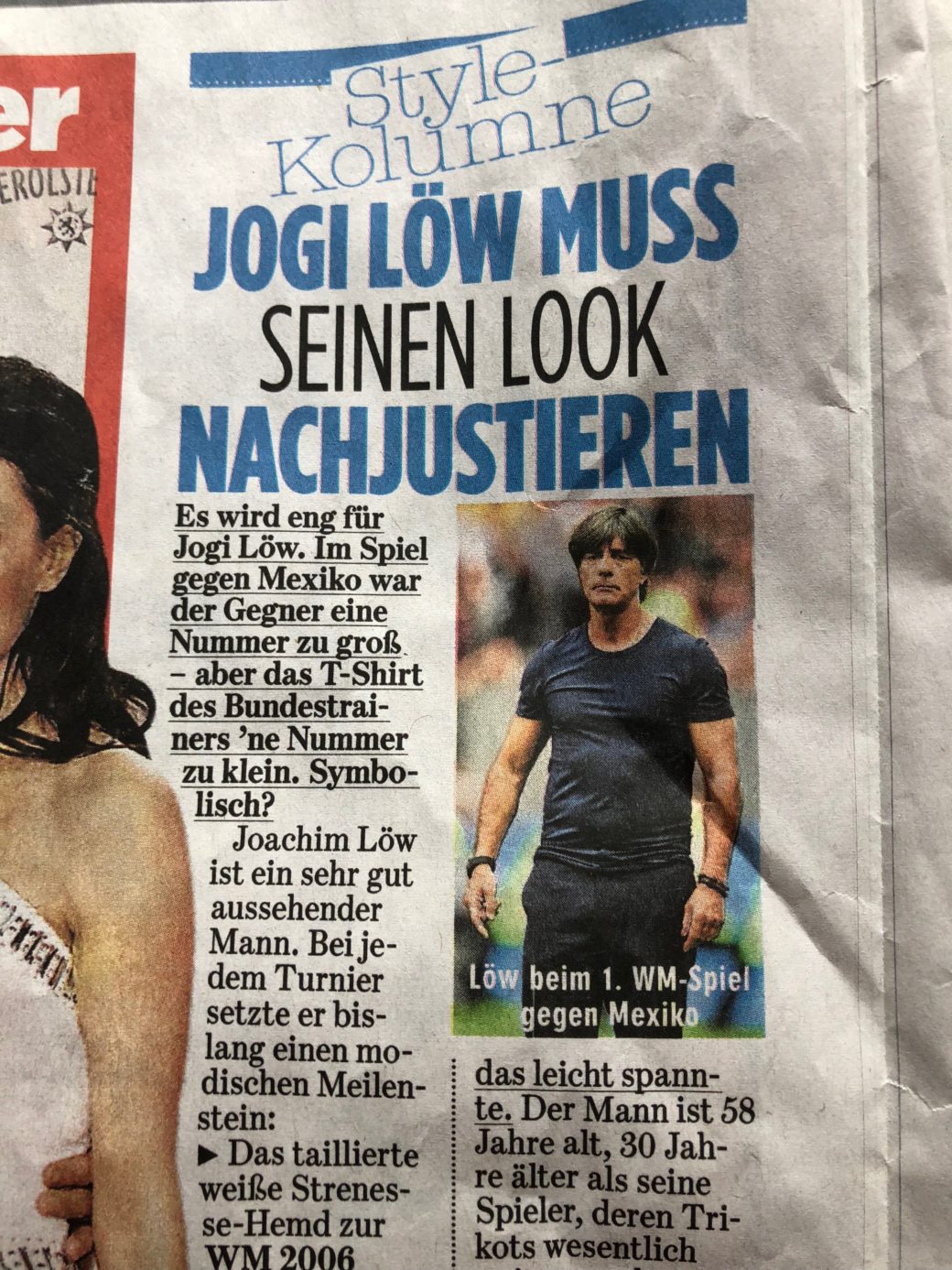 Üble Beleidigungen kursieren über Löw’s T-Shirt im Netz. Das hat der Bundestrainer nicht verdient. Er hat Stil und Geschmack und einfach nur einen schlechten Tag erwischt, wie seine Mannschaft ja auch. Deshalb: Schwamm darüber – oder besser: Sakko darüber.